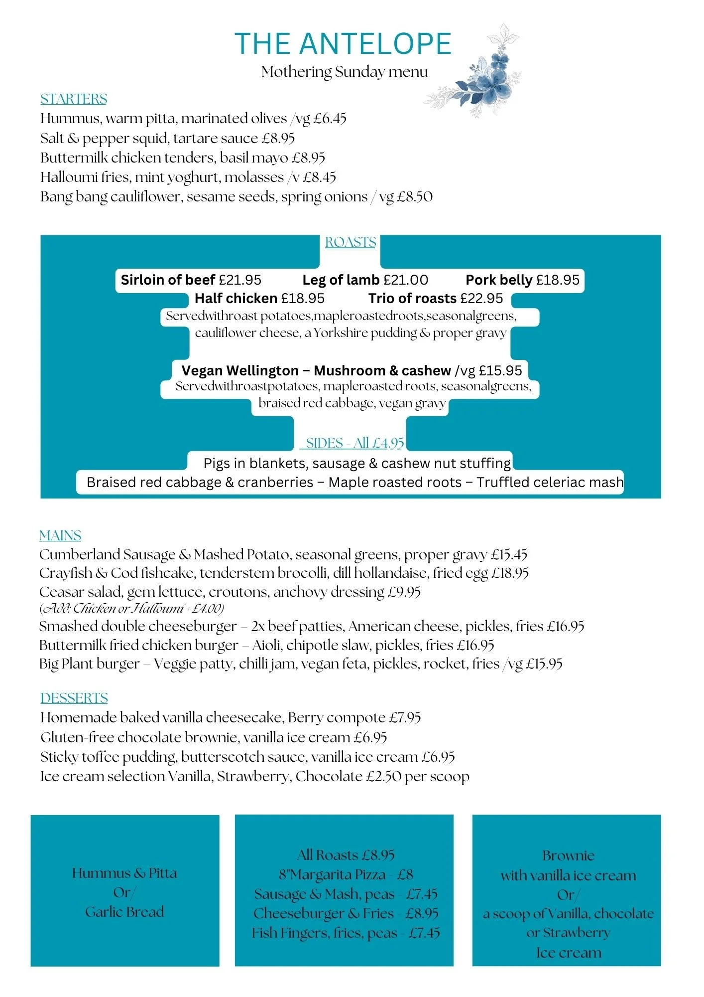 We will be serving a slightly reduced menu on Mother’s day this year.